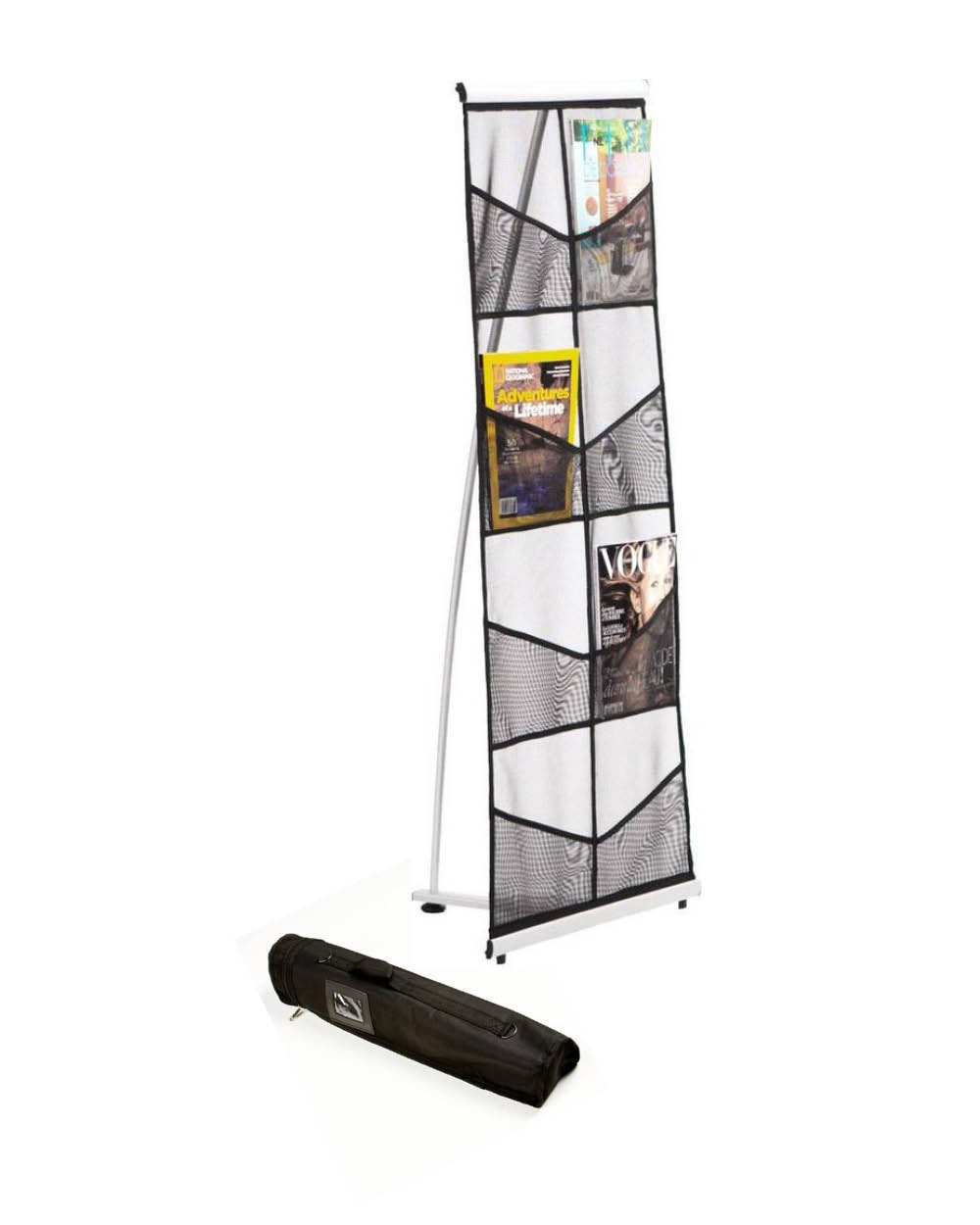 Lichtgewicht brochurehouder voor beurzen, open dagen, presentaties, makkelijk vervoerbaar in bijgeleverde draagtas en compact op te bergen.
